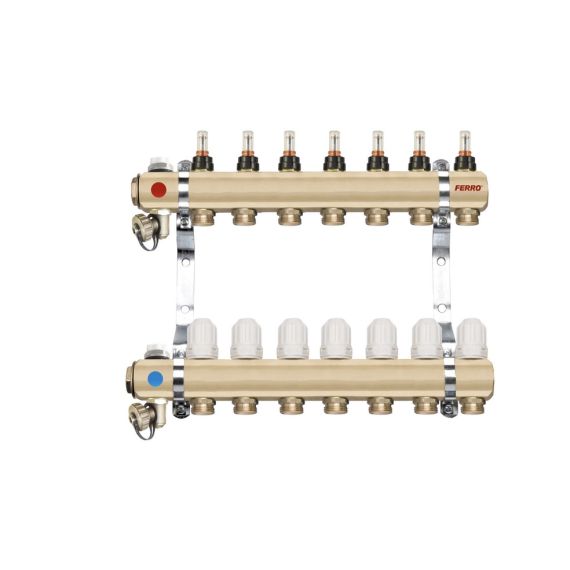 Distribuitor/colector cu debitmetre si robineti termostatici pe fiecare cale, pe care se pot atasa la nevoie electrovane ce pot fi comandate de termostate, pentru sisteme de incalzire in pardoseala.