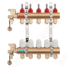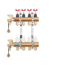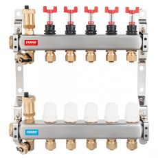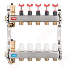 Ferro Dist. 1" 8 Circuite cu Debitmetre, Rob. Termostatati 16X1/2". presiune max 6 bar, material alamă, racord 1/2", dimensiuni 210x400 mm.